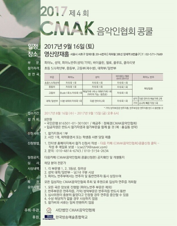 제4회 CMAK 음악인협회 콩쿨 에 지원하신 모든 분들께 응원을 보냅니다.